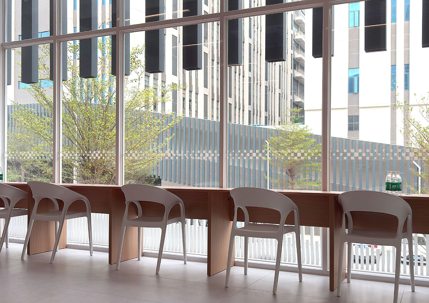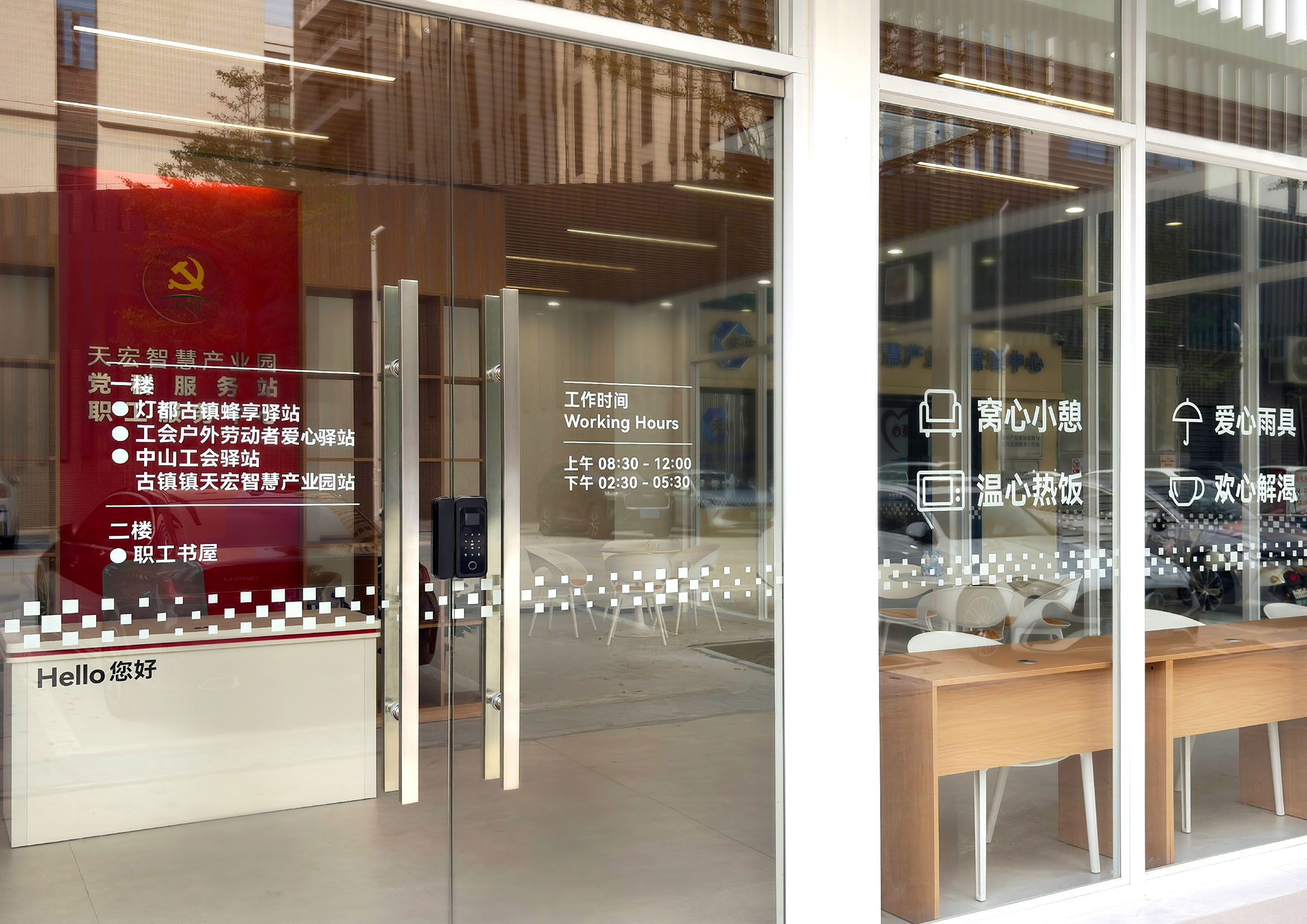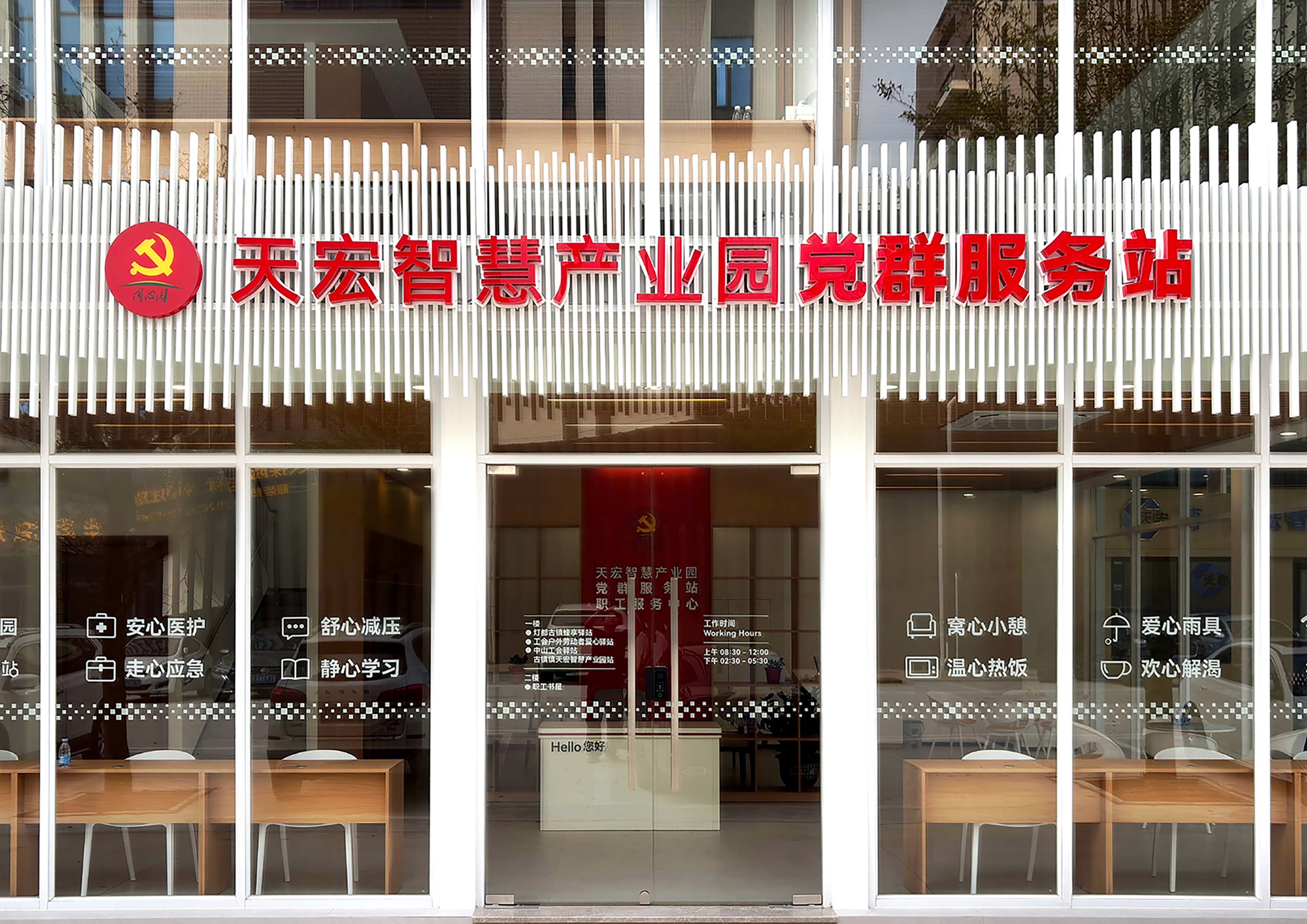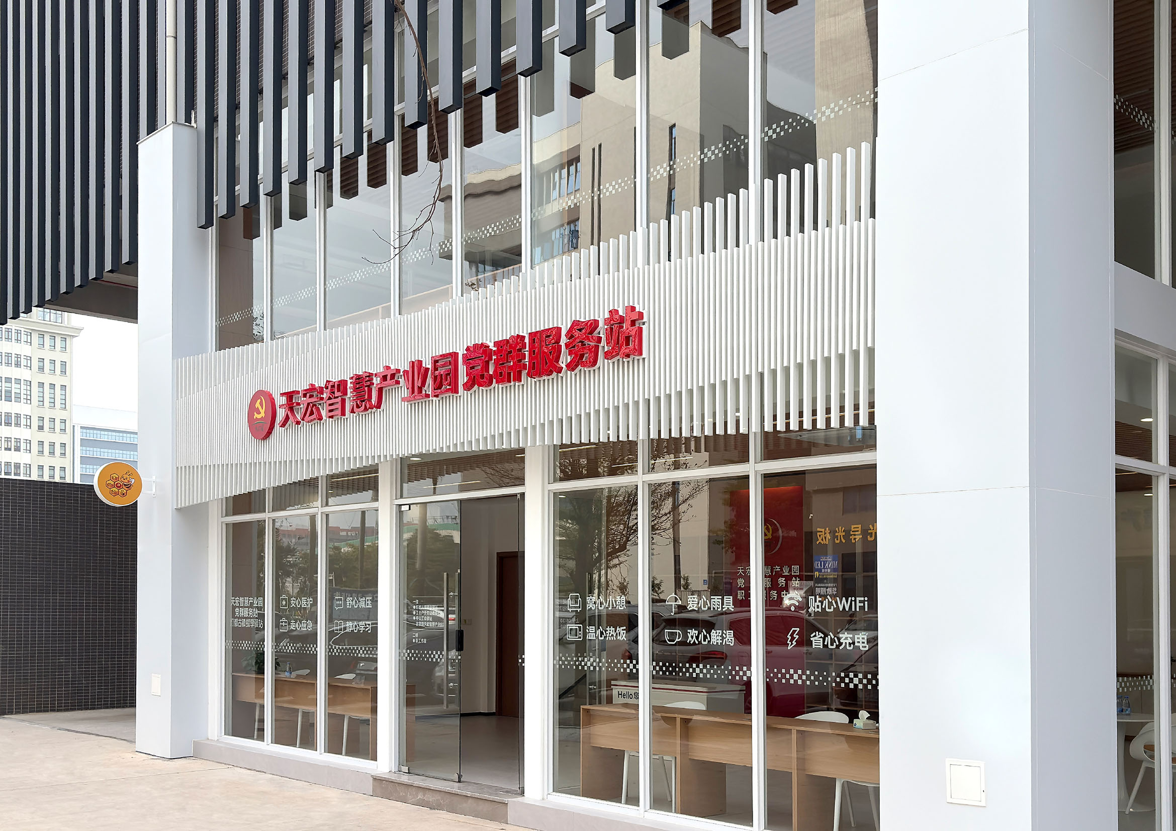 在空间设计上,服务站尽显巧思。以现代简约风格为主,采用钢结构搭配全景落地玻璃的组合,白天将阳光最大限度引入室内,让整个空间通透又温暖,无需过多照明就能保持明亮;夜晚室内灯光亮起,与窗外园区夜景相映,成为一处兼具实用性与观赏性的打卡点。这种开放无阻隔的设计,也悄悄拉近了党建服务与群众的距离,让交流更轻松、服务更贴心。