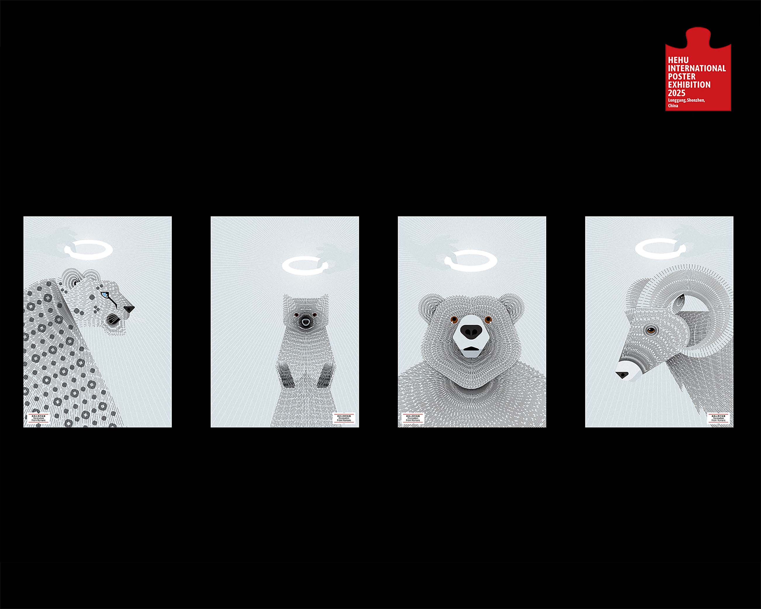 受资本利益驱使,人类大肆猎杀野生动物。例如:雪豹皮毛、貂鼠绒毛、熊胆、羊角等,都成了商品化的猎物,导致众多物种濒临灭绝。这套为曹一村设计的爱护野生动物公益海报以独特创意直击痛点:画面中一只不起眼的手为动物带上“光环”,看似是“来自人类的加冕”,实则象征人类是导致它们灭亡的幕后黑手;文字以标签形式呈现,深刻揭露人类将野生动物商品化的罪行,以此唤起大众保护野生动物的意识。
