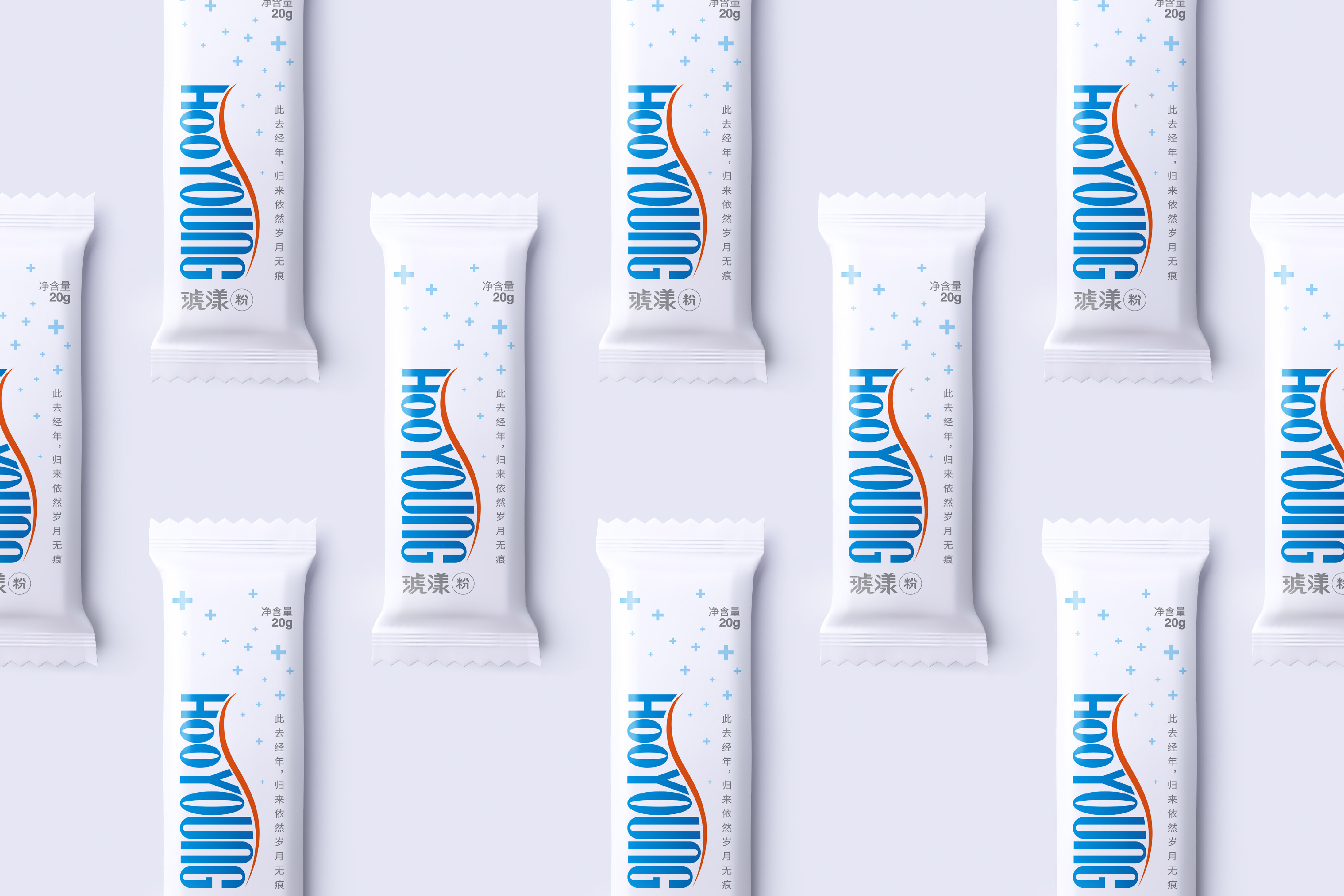 “HOO YOUNG” 字体设计以字母的有机组合加上一条曲线,呈现出人体纤细的腰曲线美,展示了产品的功能性,logo有两种不同的呈现方式,分别是上下呈曲线,可以根据不同的场景使用;当“HOO YOUNG” 旋转90度,更直观地呈现出一条纤细的腰曲线;“琥漾”字体设计里隐藏着一个“+”的符号,是医药的体现,我们提取“+”这个元素,组成花纹,点缀整个包装的同时,也很好的体现了医药这个性质;包装采用大面积的留白,搭配蓝色和橙色,使包装的设计简洁,可靠和国际化。