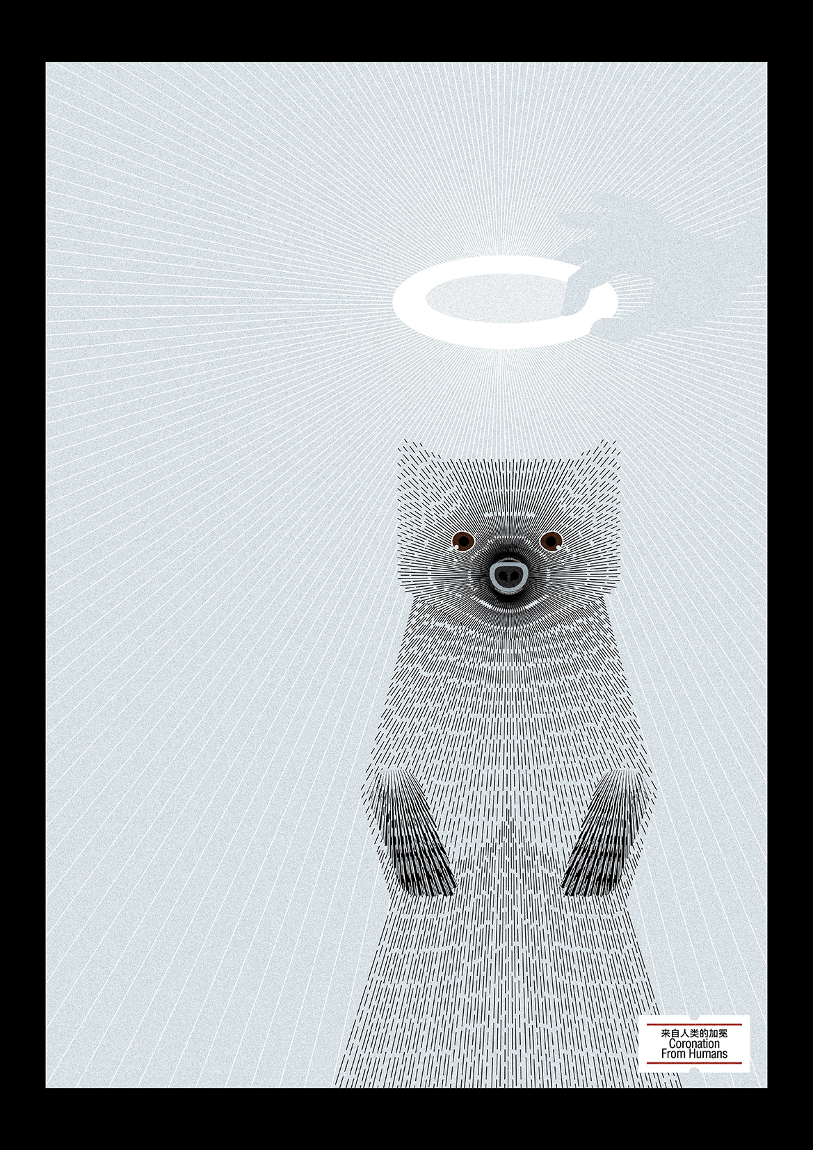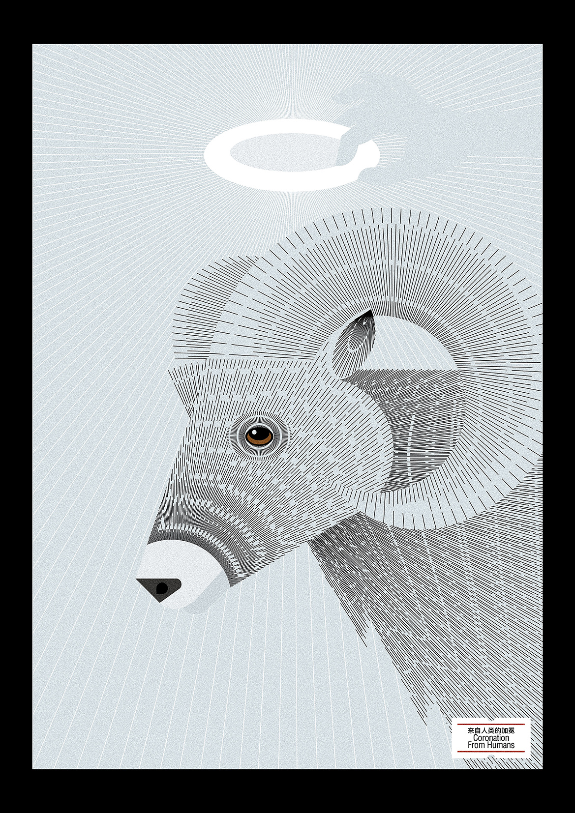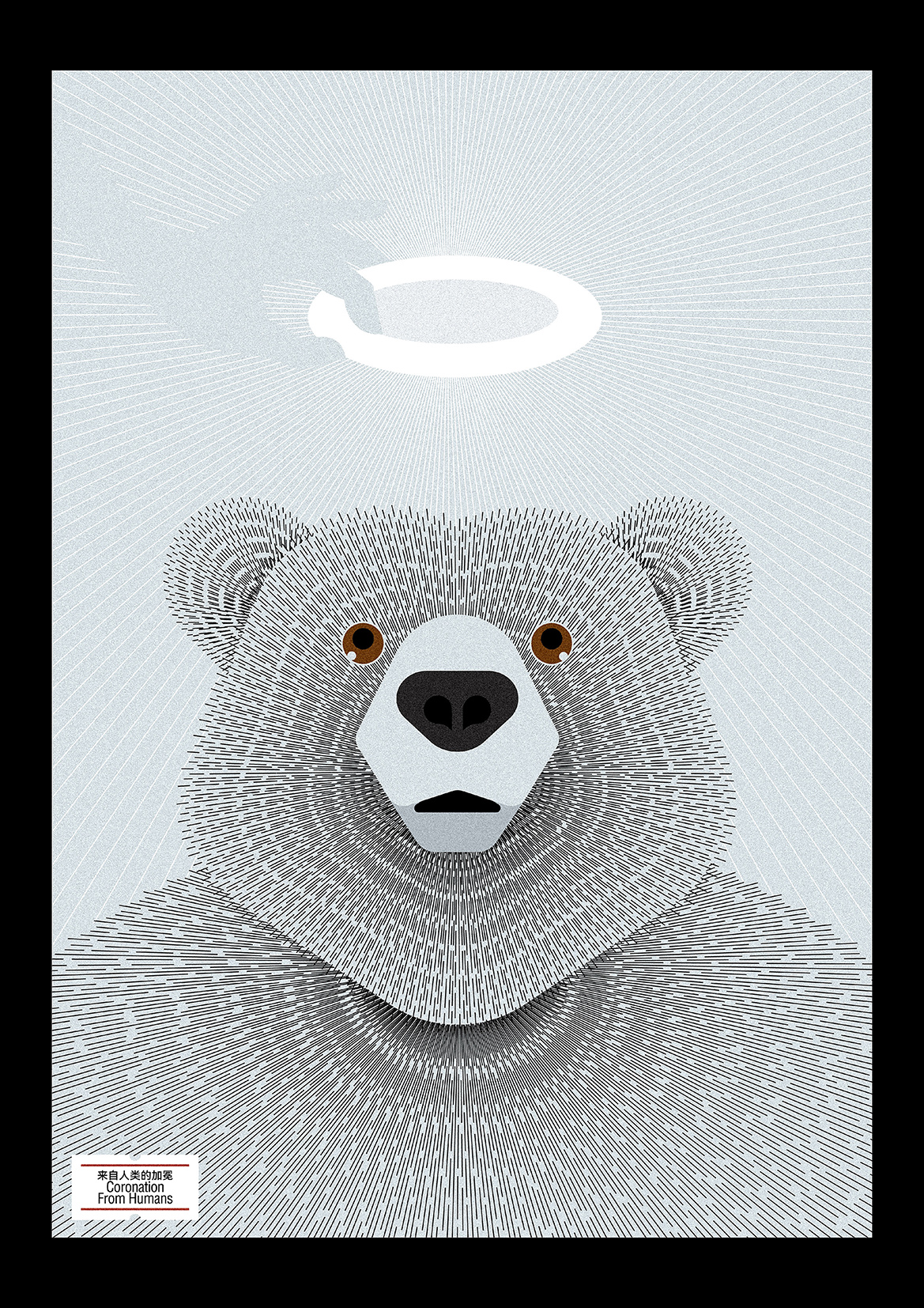 受资本利益驱使,人类大肆猎杀野生动物。例如:雪豹皮毛、貂鼠绒毛、熊胆、羊角等,都成了商品化的猎物,导致众多物种濒临灭绝。这套为曹一村设计的爱护野生动物公益海报以独特创意直击痛点:画面中一只不起眼的手为动物带上“光环”,看似是“来自人类的加冕”,实则象征人类是导致它们灭亡的幕后黑手;文字以标签形式呈现,深刻揭露人类将野生动物商品化的罪行,以此唤起大众保护野生动物的意识。